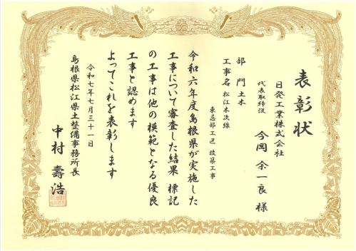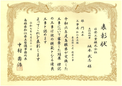島根県優良工事等表彰 2025年08月01日 島根県松江県土整備事務所長より 「(主)松江木次線(東忌部工区)防安交付金(改築)工事 第18期」の 優良建設工事表彰並びに優秀建設技術者表彰を受賞しました。 一覧に戻る