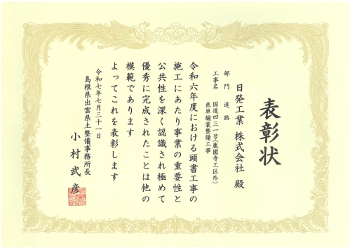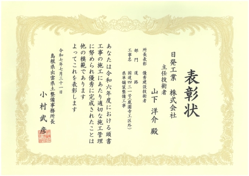 優良工事表彰並びに優秀建設技術者表彰を受賞しました。